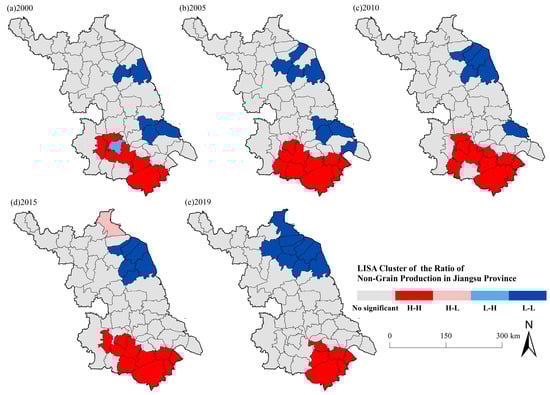 The spatial distribution of NGPCL in Jiangsu Province is depicted in Figure 5. Across all counties in Jiangsu Province, NGPCL distribution exhibited clear spatial differentiation characteristics. Southern Jiangsu emerged as a focal point for NGPCL concentration throughout the study period, boasting the highest NGPR in the province. Central Jiangsu has experienced a notable increase in NGPCL from 2000 to 2019, accompanied by a rise in the NGPR. Conversely, northern Jiangsu has witnessed a decline in NGPCL and a corresponding decrease in NGPR, alongside a resurgence in grain cultivation activities. By 2019, Jiangsu Province had established a spatial pattern characterized by a “high prevalence of NGP in the central and southern regions, with lower levels in the northern areas”.