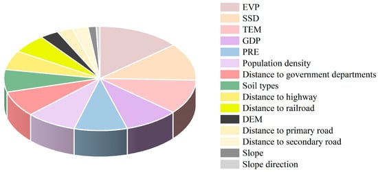 The contribution of the drivers of NGPCL could be derived from LEAS (Figure 11). EVP, SSD, TEM, GDP, PRE, and population density had a high contribution to NGPCL, while distance to government departments, soil types and distance to roads at all levels also had a certain influence on NGPCL, and topographic factors had the lowest driving force for NGPCL.