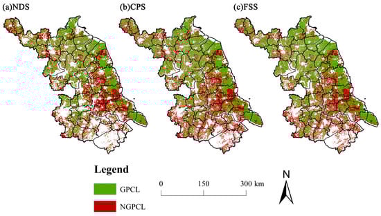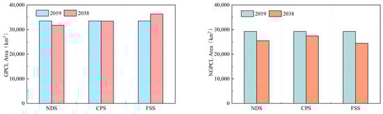 NGPCL will broadly maintain its current spatial pattern under the three scenarios, with denser concentrations in the south and center and sparser distribution of NGPCL in the north. In the NDS, there will be a large reduction in both NGPCL and GPCL; in the CPS, the reduction in NGPCL and GPCL will be somewhat suppressed; and in the FSS, the trend of reduction in GPCL will be reversed and the degree of NGP will be further suppressed.