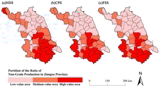 The NGPR under the three scenarios was divided according to the previous grading (Figure 14). The distribution of the NGPR in Jiangsu Province under the three scenarios will maintain the overall distributional characteristics of 2019, with higher NGPR in the south and center and lower in the north.