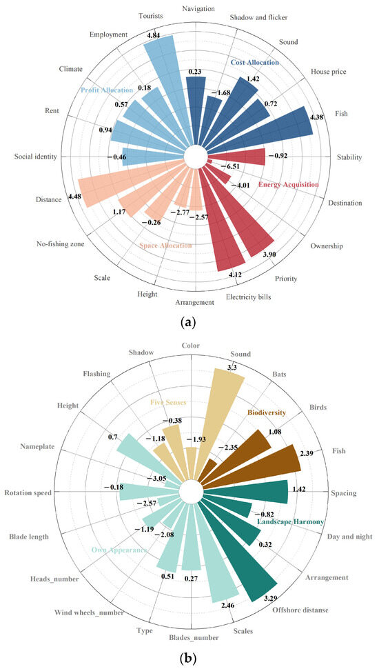 The analysis of tourist groups integrated statistical results from both choice models, one with and one without cut-offs. Judging by the fit of the model, the Log-likelihood indicates that the model considering attribute cut-offs achieves a better fit and more accurately reflects the real choices of tourist groups. This result is consistent with the findings of Nie et al. [100]. From the perspective of model robustness, the direction and significance of various attributes, except for the scale attribute, do not change before and after the incorporation of cut-offs, indicating that the model is overall robust. The change in the significance of the scale attribute before and after suggests that the utility tourists derive from the scale attribute of OWFs is more composed of the negative utility generated by the violation of cut-offs.