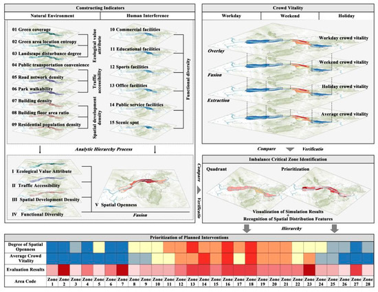 The degree of spatial openness is a comprehensive manifestation of waterfront space’s attractiveness, diversity, and competitiveness, directly affecting spatial vitality [48,49,50]. This paper constructs the evaluation index system and research framework (Figure 2) of the degree of openness of waterfront space, which is mainly divided into the following three steps: (1) Considering the accessibility and representativeness of the indicators, this paper screens and summarizes the constituent elements affecting the degree of openness of urban waterfront space and constructs the evaluation indicators of the degree of openness of waterfront space from a multi-dimensional perspective (including ecological value attribute, traffic accessibility, spatial development density, and functional diversity of four aspects with a total of 15 indicators) to assess the degree of openness of waterfront space comprehensively. (2) Through the Arc GIS platform, spatial analysis of all-day multi-moment thermal data of typical weekdays, holidays, and rest days in the study area was carried out to understand the spatial distribution characteristics of the vitality of waterfront spaces on both sides of the Xiangjiang River as a whole. (3) Based on the evaluation results and weights of each index, analyze the degree of openness and matching of vitality intensity of each waterfront space zone and introduce the concept of planning intervention priority to classify the order of planning intervention of waterfront space zones. According to the simulation and analysis results, the macro layout strategy of waterfront space is adjusted, which can provide a scientific basis for the rational planning of urban waterfront space and allocation of public resources.