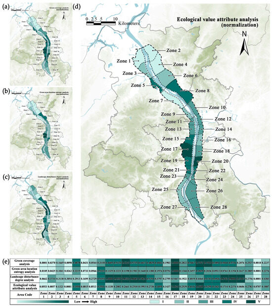 Ecological value attribute analysis: (a) green coverage analysis; (b) Green area location entropy analysis; (c) landscape disturbance degree analysis; (d) ecological value attribute analysis; and (e) grading of ecological value attributes.