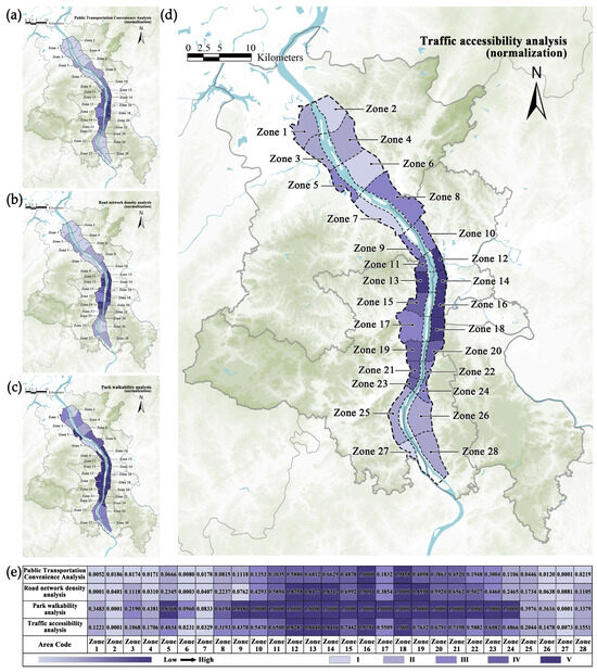 Traffic accessibility analysis: (a) public transportation convenience analysis; (b) road network density analysis; (c) park walkability analysis; (d) traffic accessibility analysis; and (e) grading of traffic accessibility.