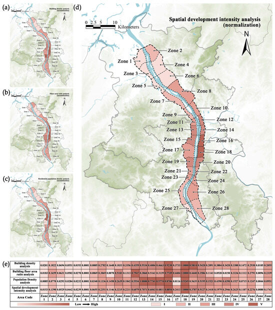 Spatial development intensity analysis: (a) building density convenience analysis; (b) floor area ratio analysis; (c) residential population density analysis; (d) spatial development intensity analysis; and (e) grading of spatial development intensity.