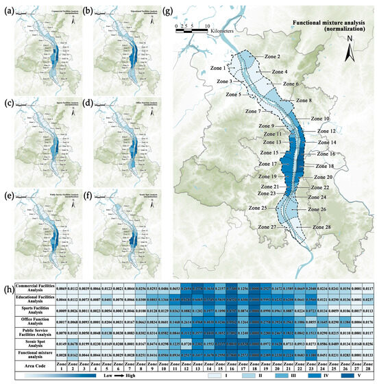 Functional diversity degree analysis: (a) commercial facilities analysis; (b) educational facilities analysis; (c) sports facilities analysis; (d) office facilities analysis; (e) public service facilities analysis; (f) scenic spot analysis; (g) functional diversity degree analysis and (h) grading of functional diversity.