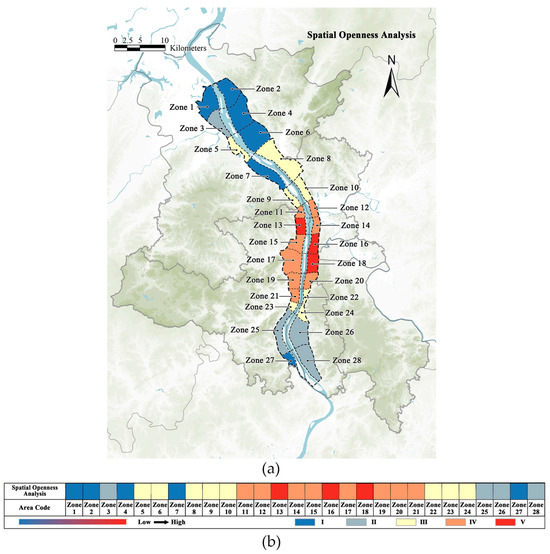 Based on the results of the ecological value attribute analysis, traffic accessibility analysis, spatial development intensity analysis, and functional diversity degree analysis, the openness of Xiangjiang River waterfront space is calculated using Formula (1), and the results show the following (Figure 7): the high-level areas with a high degree of openness are concentrated in the middle of the Xiangjiang River, with overall spatial facilities being perfected and maturely constructed. Among them, Zones 11–12, 14–15, 17, and 19–20 are IV levels, while Zones 13, 16, and 18 are V levels. The openness of waterfront space zones in the northern part of the Xiangjiang River (Zones 1–10) and the southern part of the Xiangjiang River (Zones 21–28) lags behind the middle part of the Xiangjiang River in all aspects and is mainly of Grade I–III. This situation is because the spatial construction of the northern and southern Xiangjiang Rivers is affected by geographic deviation and the limitation of economic radiation diffusion. In addition, the west bank of the Xiang River has been built for a shorter period. It has many mountains, resulting in a significantly lower degree of openness than the east bank of the Xiangjiang River.