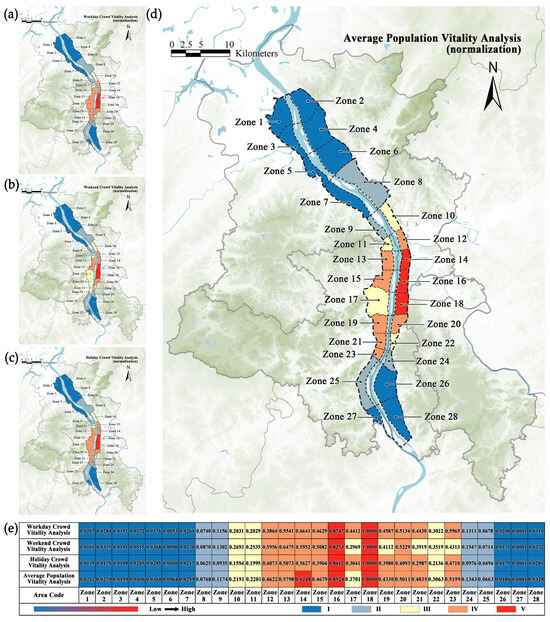 Analysis of average crowd vitality in Xiangjiang River waterfront space: (a) workday crowd vitality analysis; (b) weekend crowd vitality analysis; (c) holiday crowd vitality analysis; (d) analysis of average crowd vitality; and (e) grading of space vitality intensity.