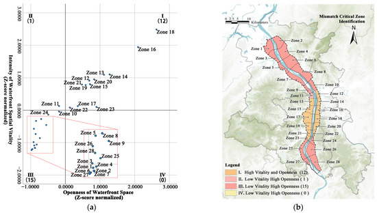 The openness index and vitality index of Xiangjiang River waterfront space were Z-score normalized, and the waterfront spatial zones were divided into quadrants according to the results of Z-score normalization. The quadrant distribution results (Figure 9a) show that 12 waterfront spatial zones are in the “high openness–high vitality intensity” (Quadrant I), 1 waterfront spatial zone is in the “low openness–high vitality intensity” (Quadrant II), 15 waterfront spatial zones are in the “low openness–low vitality intensity” (Quadrant III), and no waterfront spatial zone meets the characteristics of “high openness–low vitality intensity” (Quadrant IV).