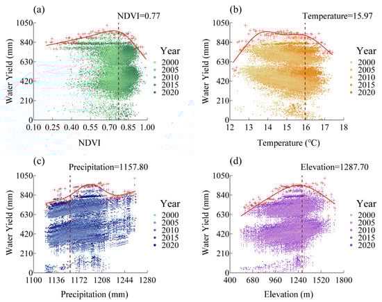The effects of different natural factors on water yield varied considerably (Figure 3a–f). Water yield increased faster when the NDVI was less than 0.77, and then it showed a rapid decline (Figure 3a), which indicated that it was more sensitive to the effects of the NDVI and that high vegetation cover could help to increase the water yield, but overly dense vegetation would cause a decrease in it. The water yield was higher when the temperature was greater than 15.97 °C (Figure 3b) and the precipitation was greater than 1157.80 mm (Figure 3c), which indicated that higher temperatures and more precipitation had a positive effect on it. In addition, the water yield had a significant increasing trend with elevation, and it was at a high level after the elevation was greater than 1287.70 m (Figure 3d). When the slope was less than 43.64° (Figure 3e) and the relief amplitude was less than 331.60 m (Figure 3f), the water yield could be maintained at a high level, which indicated that a moderate slope and relief amplitude were favorable for increasing the water yield.