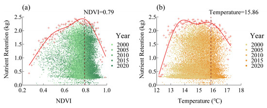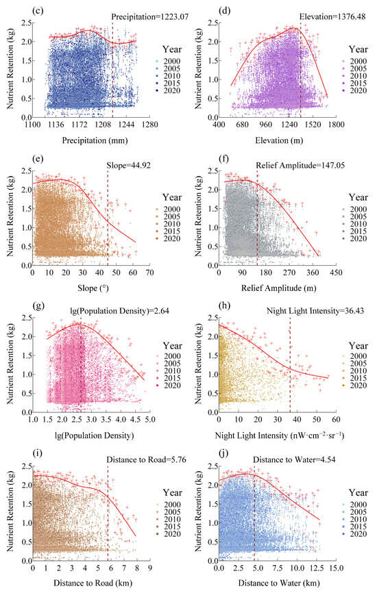 Nutrient retention was differently affected by different natural factors (Figure 4a–f). An NDVI greater than 0.79 resulted in higher nutrient retention (Figure 4a), indicating that increased vegetation was more favorable for water purification. Nutrient retention was able to provide a higher level when the temperature was greater than 15.86 °C (Figure 4b), and higher temperature increased nutrient retention. Nutrient retention was higher when precipitation was less than 1223.07 mm (Figure 4c), indicating that suitable precipitation was more effective for water purification. Changes in elevation caused large fluctuations in nutrient retention, and when the elevation was less than 1376.48 m, it tended to increase significantly and then declined faster (Figure 4d). Lower elevation was favorable for controlling the higher level of water purification. When the slope was less than 44.92° (Figure 4e) and the relief amplitude was less than 147.05 m (Figure 4f), the nutrient retention was higher and then decreased rapidly, indicating that areas with a lower slope and relief amplitude were areas of concern for high water purification levels. Water purification services responded more sensitively to changes in slope and relief amplitude.