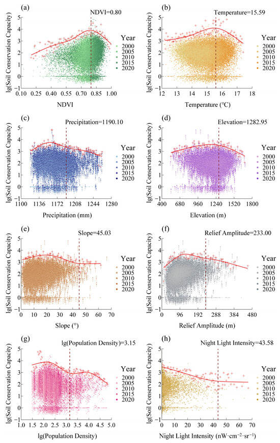 Soil conservation capacity responded differently to changes in different natural factors (Figure 5a–f). Soil conservation capacity was higher when the NDVI was greater than 0.80 (Figure 5a), suggesting that high vegetation cover was likewise beneficial in increasing its level. Soil conservation capacity showed an increasing trend when the temperature was less than 15.59 °C (Figure 5b) and precipitation was less than 1190.10 mm (Figure 5c), after which it decreased significantly, indicating that a relatively mild climate was helpful in increasing the level of soil conservation capacity. Soil conservation capacity showed an increase and then a decrease with elevation, and it gradually increased when the elevation was less than 1282.95 m (Figure 5d). However, the threshold was relatively insignificant, and the elevation could be excluded as a key concern. When the slope was less than 45.03° (Figure 5e) and the relief amplitude was less than 233.00 m (Figure 5f), the soil conservation capacity could be maintained at a certain higher value.