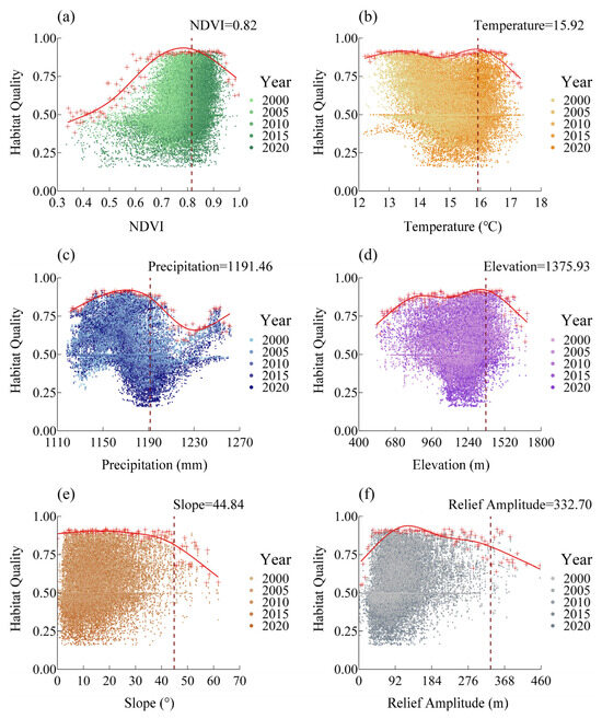 Habitat quality varied greatly with natural factors (Figure 6a–f). Habitat quality was elevated with the increase in the NDVI, and it was higher when the NDVI was greater than 0.82 (Figure 6a), indicating that areas with higher vegetation cover had higher habitat quality. Habitat quality was higher when the temperature was less than 15.92 °C (Figure 6b) and precipitation was less than 1191.46 mm (Figure 6c), after which it began to decrease, and suitable temperature and moderate precipitation were helpful in improving it. Habitat quality could be maintained at a high level when the elevation was higher than 1375.93 m (Figure 6d), indicating that it was higher in higher-elevation areas. When the slope was less than 44.84° (Figure 6e) and the relief amplitude was less than 332.70 m (Figure 6f), the habitat quality was maintained at a high value, and a smaller slope and relief amplitude were able to maintain a high habitat quality.