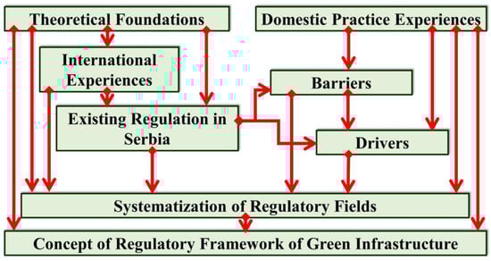 Consequently, research conducted between 2018 and 2023 in Serbia surveyed 352 professionals and representatives of 33 city and state organisations relevant to GI. The aim was to identify barriers and drivers within a broad conceptual framework in the following areas: (1) formulating a legal framework for GI; (2) regulating the conservation of existing GI elements; (3) improving GI planning regulation; (4) improving regulation in the fields of design and construction; (5) enhancing regulation for green infrastructure maintenance; (6) regulating GI management; and (7) enhancing awareness, knowledge, and information dissemination about GI.
