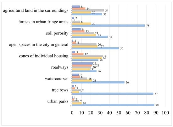 Of the nine provided terms, all the elements of green infrastructure were rated as being significant. However, experts considered parks, tree rows, and urban fringe forests to be the most important elements of green infrastructure. The importance of roadways, zones of individual housing, and agricultural land was rated the lowest.