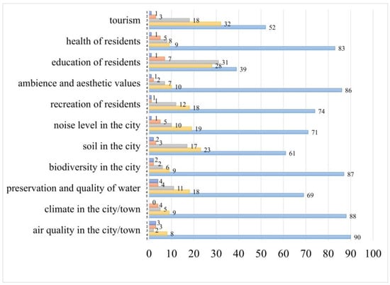 Of the 11 provided responses, experts assessed that GI was very significant for all 11 contributions but mostly for its impacts on the climate, air quality, biodiversity, and ambience. Respondents less commonly perceived the importance of GI for residents’ education and soil quality.