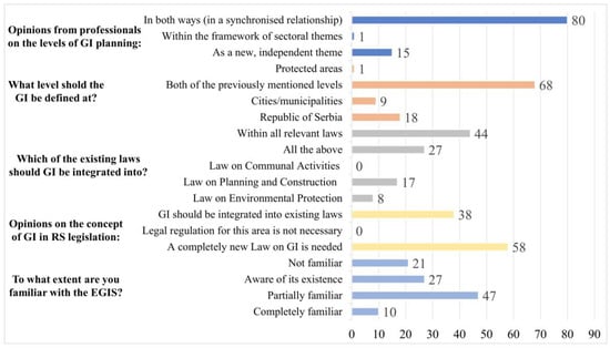 In response to open-ended questions, various measures were proposed to enhance the development of GI in Serbian cities through legislative regulation, rules, organisation, standards, etc.