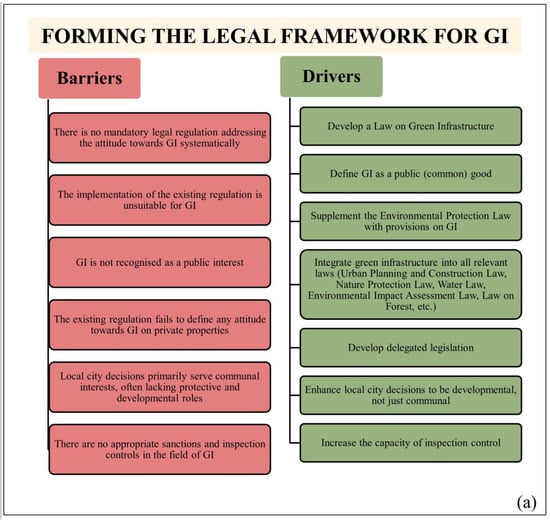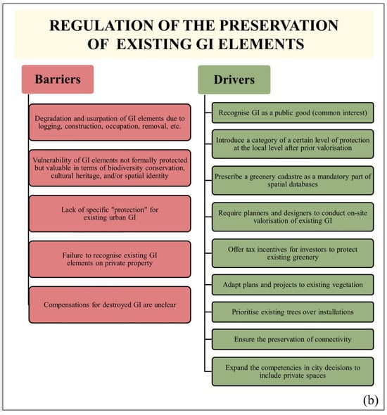 After five years of thorough research, we conclude that this study surpasses national significance as GIS planning and design manifest in various dimensions and environments as strategic concepts integrated into international policies of the world and the EU as well as regional, national, and local concepts. This study introduces a novel framework (concept) compared to previous research endeavours. This framework, based on professionals’ perspectives, comprises seven key indicator areas: formulating a legal framework for GI, regulating the conservation of existing GI elements, improving GI planning regulation, improving regulation in the fields of design and construction, enhancing regulation for green infrastructure maintenance, regulating GI management, and enhancing awareness, knowledge, and information dissemination about GI. This study provides detailed descriptions of drivers used to overcome identified GI barriers, among which the most significant ones are the drafting of GI legislation; the designation of GI as a common good; the integration of GI principles into all the relevant laws, sublegal acts, and local city decisions; expanding regulatory oversight over private spaces; increasing inspection controls; introducing compensation mechanisms for greenery destruction; mandating greenery cadastres within spatial databases; the prohibition of green space conversions; obliging planners and designers to valorise the existing GI while respecting the interconnectedness and unity of blue–green corridors; offering tax incentives for biodiversity conservation; raising awareness and educating decision-makers, governmental bodies, investors, and the public; supporting projects and non-governmental organisations advocating for GI; implementing “green certification” for facilities incorporating GI features; and introducing ecological index norms in planning in line with contemporary needs for water conservation, soil porosity, connectivity, green roofs, green facades, etc. This study establishes a globally and regionally applicable framework that can be replicated to fulfil broader objectives of sustainable urban revitalisation.