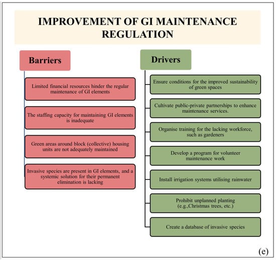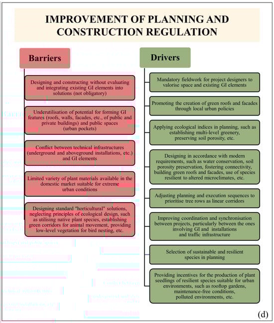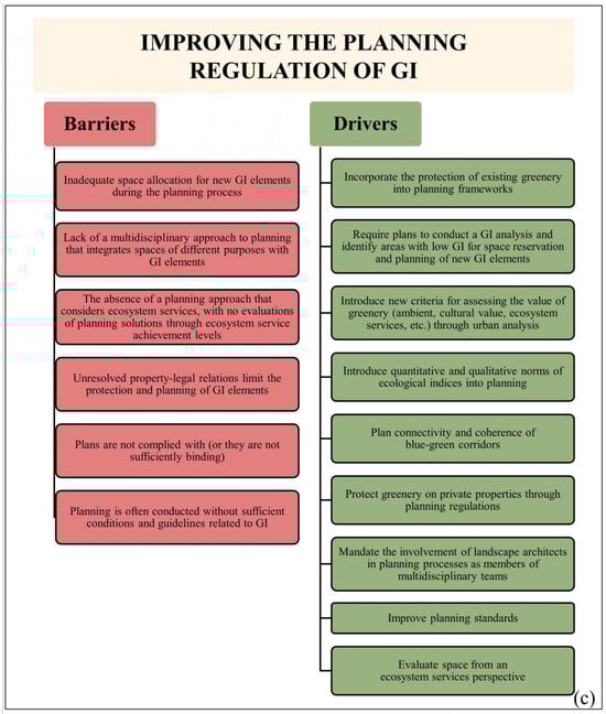 The rationale for enhancing the regulatory framework for designing and constructing sustainable, resilient, and smart cities and GI networks (Figure 6d) stems from the 2030 Agenda for Sustainable Development and current European strategies: the EU GI Strategy, EU Climate Adaptation Strategy, EU Biodiversity Strategy for 2030, and other strategic documents [56,57,58], which recognise GI and nature-based solutions as being critical approaches and tools for design and implementation in urban environments and landscapes. Our research identifies drivers for GI design and construction at both holistic and specific levels. Specifically, the experiences and empirical findings of national professionals underscore the importance of public involvement and engagement, as well as the wide array of ecosystem services provided by GI and its elements, including some potential ecosystem disservices. Our findings in this regard partially align with results cited by Hanna and Comín [17], Tzoulas et al. [59], the Forestry Commission [60], Toth and Timpe [61], Williams [62], and Pochodyła et al. [63].