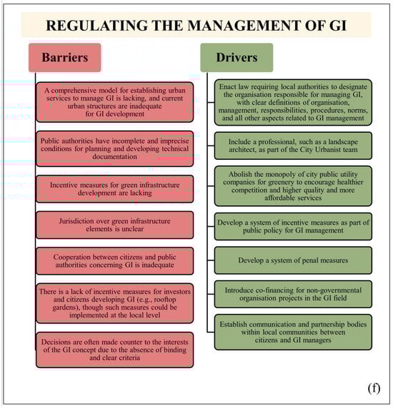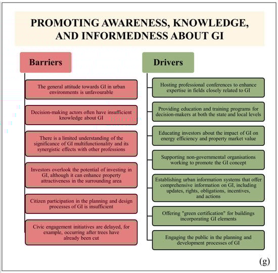 The development of green urban infrastructure and its management in urban centres are facilitated and strengthened by policies, strategies, and other legal instruments. At the national level, several documents have been developed in recent years; however, they have little connection with the development and management of green urban infrastructure. Additionally, experts, government officials, and the public do not interpret these documents in the same way, which aligns with the findings of Keita and Kourouma [41]. Urban GI is a strategically developed network of green spaces that can improve the quality of the environment and provide significant economic benefits [17]. It is in line with the Sustainable Development Goal [42], which calls for resilient, safe, sustainable, and inclusive cities. However, the primary barrier for creating and managing urban green infrastructure is the lack of commitment, competent workforces, financing, and public participation. This study aims to identify existing research and policy gaps and complement the limited empirical literature on RGI. The identified barriers and drivers (Figure 6a–g) serve as a database for institutions involved in the development and management of GI, including legislators, planners, managers, and other interested groups.