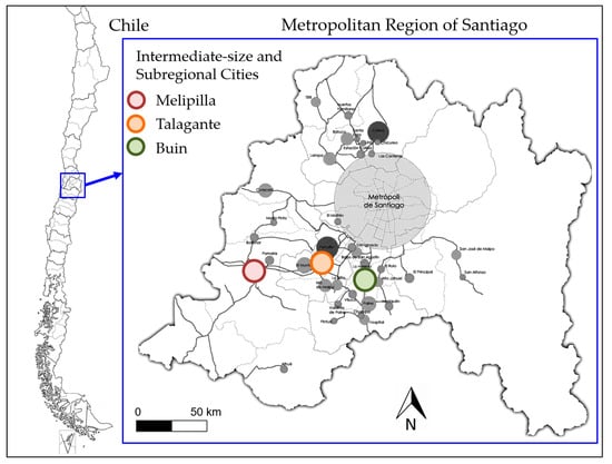Study area: Intermediate-sized and subregional cities of Melipilla, Talagante, and Buin in the Metropolitan Region of Santiago, Chile. Source: Author’s own elaboration based on [47,48].