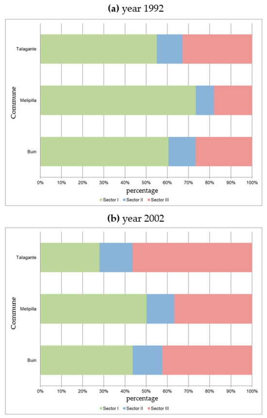 Structure of the economically active rural population in the communes of Buin, Melipilla, and Talagante in the years 1992 (a) and 2002 (b). Source: Author’s own elaboration based on [52,53].
