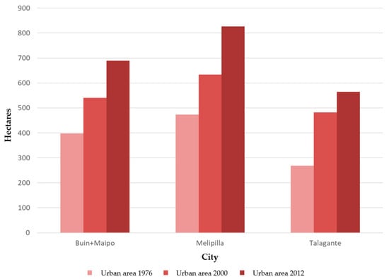 Geospatial variations of urban surface area in the cities of Melipilla, Talagante, and Buin in the 1976–2012 period. Source: Author’s own elaboration based on [44,57,58].