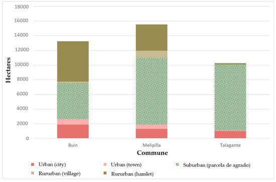 Distribution of the surface area of urban, rururban, and suburban areas in the communes of Melipilla, Talagante, and Buin in the year 2016. Source: Author’s own elaboration based on [59].