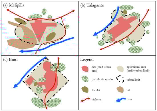 Simplified geospatial model—Chorems of the urban and peri-urban areas of the cities of (a) Melipilla, (b) Talagante, and (c) Buin.
