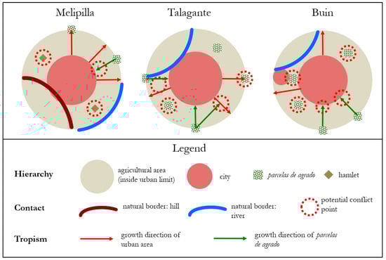 The third phenomenon is the emergence of potential conflicts with already established or developing human settlements. The term “potential” refers to the possible consequences of changing the provisions of the Metropolitan Regulatory Plan of Santiago [41] on the geographical space of the inner periurban. In this way, both parcelas de agrado and hamlets could change land use, as already observed in Melipilla, to become urban areas with a density of 160 inhabitants per hectare, unless the inhabitants of these areas wish to preserve them. Nevertheless, a previous study already noted disputes, opposition, and rejection by periurban inhabitants in relation to their local authorities [26] and a low level of collective learning among actors [27]. Power relations can be of the bottom-up type when the capacity for traditional exercise of power by local authorities and officials is lost. In summary, Figure 7 shows the simplified geospatial distribution of the main territorial phenomena analyzed for each commune. The chorems allow for the interpretation of three principles of geospatial organization—hierarchy, tropism, and contact—as described in the materials and methods.
