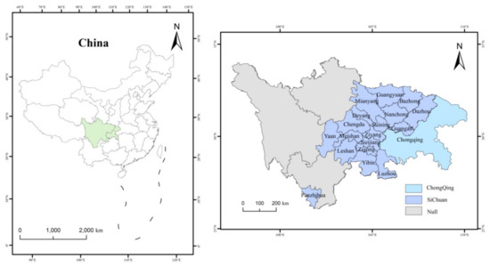 As shown in Figure 1, Sichuan Province and Chongqing Municipality are close to each other because of their proximity to each other and their similar cultural and living customs, so they often refer to the collective name of the two places as “Sichuan and Chongqing”. The Sichuan–Chongqing region, sometimes called the “southwest hinterland” and “the land of abundance”, has a population of over 120 million, making up 8.4% of the country’s total population. It covers an area of over 560,000 square kilometers, accounting for 5.9% of the country’s total area. The Sichuan–Chongqing region has the greatest growth potential in the western region and is a key component of the upper Yangtze River Economic Belt. It occupies an irreplaceable and significant position in the country’s regional strategic layout.