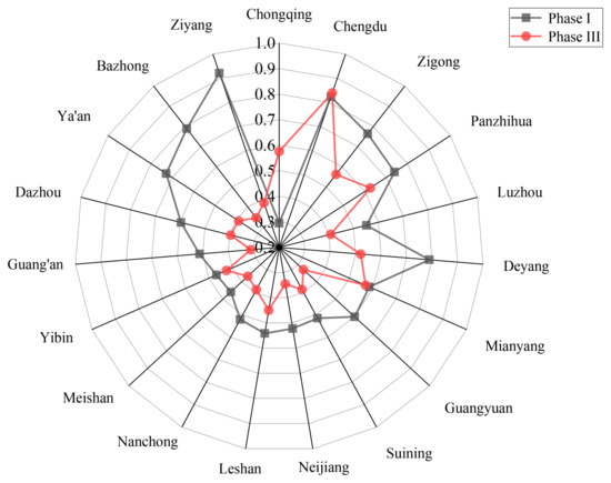 Studying the changing trend of EURI in the third stage, in Figure 3, it can be found that the EURI in Sichuan and Chongqing grew steadily, and the regional gap gradually widened in 2010–2017 and then entered a period of fluctuation in 2017–2021 with small fluctuations in the efficiency values of all cities. This transition can be attributed primarily to the rural revitalization initiative enforced by the government and the additional stringent carbon emission regulations.