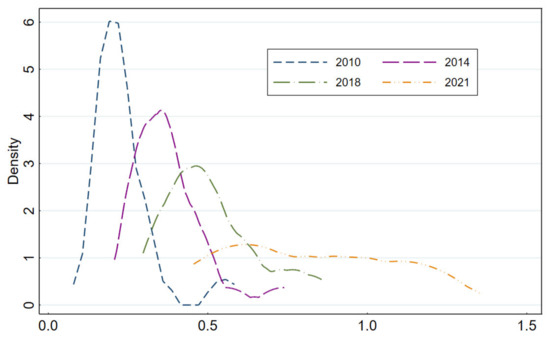Calculated based on the third stage’s efficiency results, the kernel density estimation method is used to analyze EURI in the Sichuan and Chongqing regions in 2010, 2014, 2018, and 2021 to further characterize the time-series dynamic evolution of the overall EURI in the region, as shown in Figure 5.