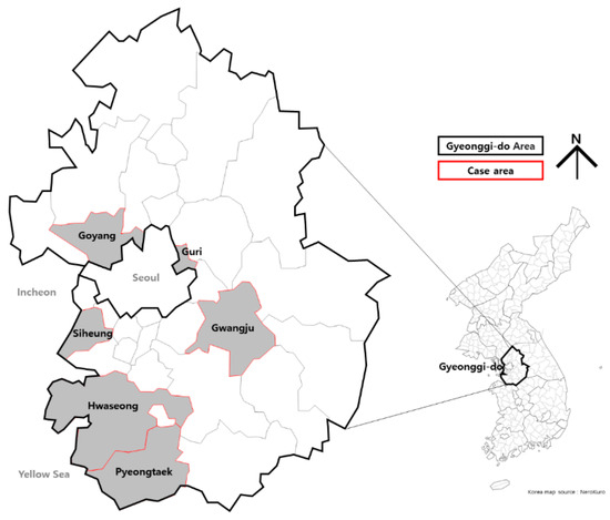 It can be easily applied when precisely setting purposes to be obtained through biotope categorization and evaluation. After collecting a list of biotope types and evaluation results from previous studies, we derived management goals for each biotope type as well as evaluation indicators for the goals. In this study, the Gyeonggi Province, which experiences the highest levels of urbanization and development pressure in South Korea, was selected as the study site. We collected data from urban ecological maps (biotope maps) for six cities: Siheung City, Goyang City, Gwangju City, Pyeongtaek City, Hwaseong City, and Guri City. These cities were chosen because they represent the country’s environment, encompassing new and old cities, coastal and inland areas, industrial and agricultural areas, and forested and plain regions (Figure 1), (Table 1).