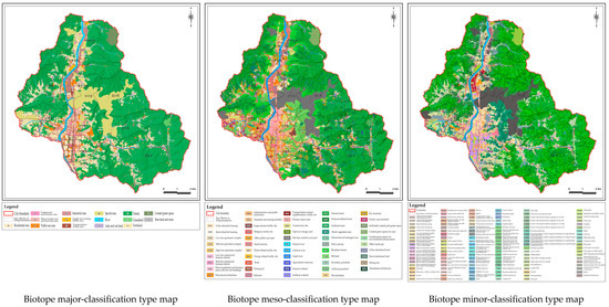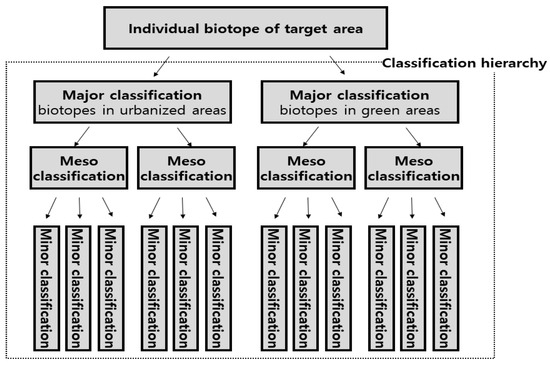 Biotope-type classification was used to sort out identical or similar biotopes by identifying the attributes of individual biotopes. Biotope-type classification is based on biotope attributes and environmental spatial data. Biotopes in urbanized and green areas in Dongducheon City were classified into major-, meso-, and minor-classification types based on the classification hierarchy shown in Figure 3.