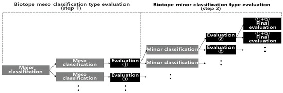 The biotope minor-classification type is based on a more detailed classification than the meso-classification type because it reflects regional characteristics of the major- and meso-classification types. The biotope meso-classification type represents standardized biotope types in a large area. The biotope minor-classification type can vary according to the unique environmental characteristics of corresponding regions. Before classifying biotope minor-classification types, evaluation criteria must be considered, that is, evaluation purposes and types corresponding to purposes must be set.