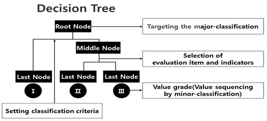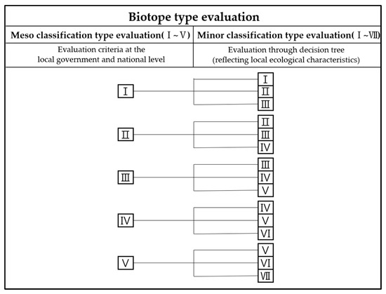 Biotope evaluation was used to evaluate the biotope value, which is mainly expressed using a grade [39]. Grading was conducted in two steps (Figure 4): biotope meso-classification type evaluation and biotope minor-classification type evaluation. Biotope meso-classification types were assigned Grades I–V (five-grade system). Criteria for each grade are listed in Table 5. Subsequently, the purpose for each minor classification type was set (Table 7) and minor-classification type evaluation (evaluation items, evaluation indicators, and evaluation criteria) was carried out for each purpose. The minor classification type was evaluated using a three-grade system and decision tree method (Figure 5). Finally, meso- and minor-classification type evaluations were combined to categorize the final minor-classification type in Grades I–VII.