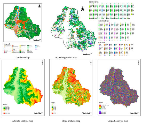 The land use map, based on existing data, was revised by comparing aerial photographs, land register maps, building management ledgers, urban planning maps, and satellite images. This map and the results from the creation of the vegetation, altitude analysis, slope analysis, and aspect analysis maps required for biotope categorization are shown in Figure 8.