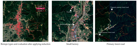 Biotope types for the reduction category were rated as Grades 6 and 7. Because these types are affected by contamination that degrades the environmental quality, measures should be implemented to reduce negative impacts. Examples include factories, power generation facilities, roads, parking lots, and railroads, which generate pollutants. Grade 6 was assigned if a purification facility was identified or a buffer function existed based on green areas. Otherwise, the biotope type was rated as Grade 7.