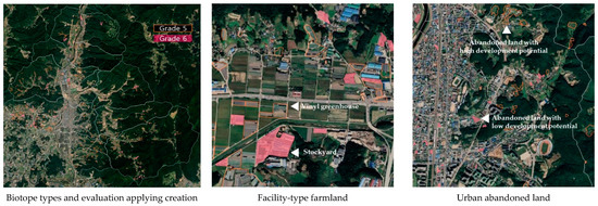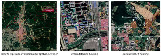 Biotope types for the creation category were rated as Grades 5 and 6. These types enhance environments based on the creation of green areas along with artificial elements in a city to improve the urban environment. Kang [48] suggested that there should be measures to increase groundwater storage, and Yoon [49] indicated that these types can lower temperatures and increase thermal comfort in a city. Grade 5 was assigned if green areas were identified around buildings or facilities, such as residential, commercial, and business buildings; the percentage of green areas was high, and rainwater collection and infiltration were possible. Otherwise, Grade 6 was assigned.