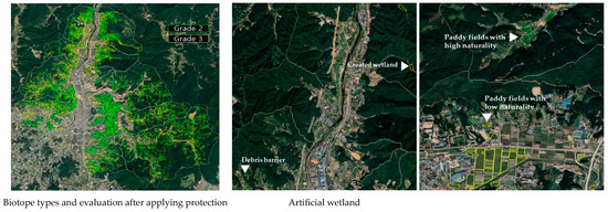 Biotope types for protection were rated as Grades 2 or 3. The number of these biotope types is gradually decreasing despite their ecological values. Kim [42] analyzed the fragmentation levels of green space biotopes through biotope maps and found a gradual increase in small green space biotope patches, indicating habitat fragmentation. Hwang [43] noted that corresponding types have high carbon storage capacity, and Kim [44] identified them as places generating cold air in a city or serving as wind corridors. Examples include lowland wetlands, forest edges close to cities, and forests fragmented by roads and cities. These types require protection measures because they are at risk of damage due to their proximity to cities. Therefore, we applied evaluation indicators that can reduce or recover from damage. If wetlands naturally retain water, forest edges restore damaged vegetation, and fragmented forests are connected, they were assigned to Grade 2. Otherwise, they were categorized as Grade 3.
