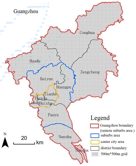 Guangzhou is located in the central part of Guangdong Province, with a total area of about 7434 square kilometers. Guangzhou contains 11 administrative divisions, namely the Yuexiu, Liwan, Haizhu, Tianhe, Baiyun, Huangpu, Panyu, Nansha, Zengcheng, Conghua, and Huadu districts. Guangzhou is the capital city of Guangdong Province, and, as an economically developed and densely populated metropolis, the aging problem is more concentrated, and its demographic problems are typical of megacities in China [42]. According to the urban development pattern of the successive versions of the master plan, Guangzhou is divided into three circles: the central urban area (Liwan, Yuexiu, Haizhu, and Tianhe districts), the suburban area (Baiyun, Huangpu, and Panyu districts), and the remote suburban area (Huadu, Nansha, Conghua, and Zengcheng districts) (Figure 2). The ageing population in Guangzhou city shows a trend of rapid and unbalanced growth in all districts, which poses specific requirements for the adjustment and optimization of the spatial layout of the social service system for older people. For the administrative area data, we divided Guangzhou into 29,793 grids of 500 m by 500 m, based on the 15-min walking distance of older people [43], and the service radius of service facilities for older people should not be more than 500 m [44,45]. Each grid has a unique number, which offers convenience for the subsequent exploration of the spatial distribution of service facilities for older people and other types of urban public service facilities.