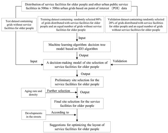 This study focuses on the megacity of Guangzhou in China. Using POI data and machine learning algorithms, we develop a street-level location selection model for new service facilities for older people in Guangzhou. Based on the range of activities of older people, we divide Guangzhou into 29,793 grid units of 500 m × 500 m. Among these grids, 985 grids contain service facilities for older people and are selected as the model training dataset. Then, we use the ID3 decision tree algorithm to train a site prediction model for service facilities for older people. Through this model, we identify 4534 grids within Guangzhou as the preliminary site selection for new service facilities for older people. Taking into account the aging rate and the number of older people in each street, we further narrow the scope and finally select 1066 grids as priority sites. Finally, based on the selected sites and the actual social conditions of each district and street in Guangzhou, we propose optimal construction strategies for service facilities for older people.