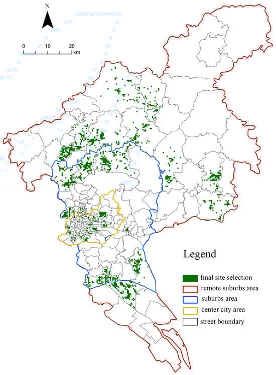 One of the main considerations when choosing the location of a new service facility for older people is to meet the demand for older people’s services of the population in the area [45]. Once the proportion of people aged 65 and over exceeds 7%, it means that the region has entered the stage of an aging society; therefore, the construction of new service facilities for older people in such a region should be prioritized. In addition, the size of the elderly population is also an important consideration in deciding whether or not to build service facilities for older people. The average number of people aged 65 and above in each street in Guangzhou has exceeded 8000; therefore, those streets with a population of more than 8000 should be the key areas for the construction of service facilities for older people in Guangzhou. The aging rate of each street was calculated based on the total populations of 171 streets and the number of older people aged 65 and above, and the selected neighborhoods with aging rates of more than 7% and streets with populations of 65 and above exceeding 8000 people. The results showed that 62 streets in Guangzhou city met the requirements. Then, using ArcGIS, all grids covered by the 62 streets were searched for suitable sites, and the grids with an existing layout of senior living facilities were removed. Finally, 1066 grids suitable for new service facilities for older people were obtained as the final site selection.