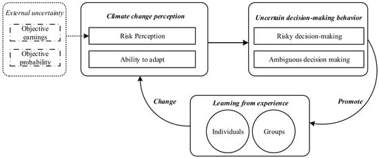 We divide the behavioral process of farmers’ risk-ambiguous decision making when faced with external uncertainty into the following three stages: climate change perception formation, behavioral decision making under uncertainty, and experiential learning [35,36].