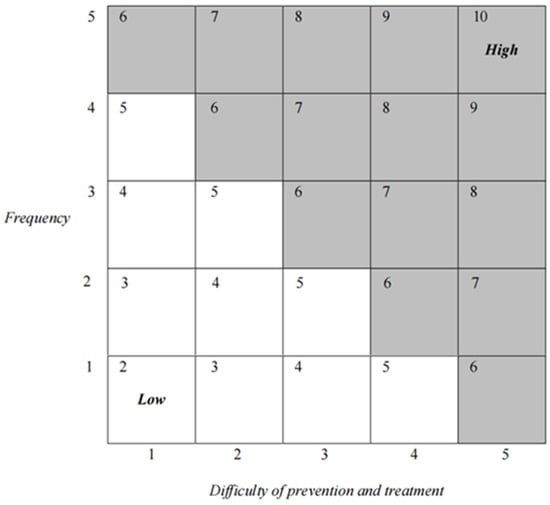We focus on farmers’ perceptions of climate change as the main explanatory variable. A climate change perception matrix was used to gauge farmers’ perceptions of climate change. By examining natural climatic conditions in the sample provinces and experimental design scenarios, we hypothesized that farmers are susceptible to four climatic hazards during wheat cultivation, including drought, heavy rainfall and flooding, low temperature and cloudy rain, and high wind and hail, and used a five-point Likert scale (Appendix A) to construct relative perception scales. Perceptual factors usually consist of perceived risk and perceived adaptive capacity [45]; in our case, drawing from previous studies, we measured farmers’ perceptions towards climate change by asking them to rate the frequency and difficulty of the control of the four climatic hazards [46]. This allowed us to assess the farmers’ level of perception towards the four risks. We summed each farmer’s ratings of frequency [47] and difficulty of control [39] of the four risks to acquire a matrix of farmers’ perceptions of climate change for each risk (see Figure 2). Climate change perception coefficients of 2–5 indicated low levels of climate change perception, while those of 6–10 represented high levels [46,48]. Finally, we averaged the four climate risk perception coefficients to measure farmers’ overall climate change perceptions.