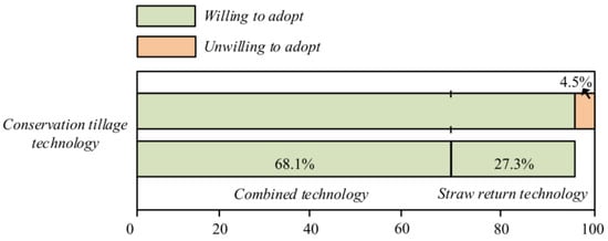 The survey results show that smallholder farmers are more willing to adopt conservation tillage technology (95.5%). Specifically, 27.3% of farmers adopted the straw-returning technology, while 68.1% have adopted the combination of straw-returning + no-tillage or subsoiling technology (Figure 3).