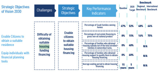 In 2016, the government announced the Saudi Vision 2030, which served as a new roadmap for the country’s socio-economic reform. Through the National Transformation Program 2020 (NTP 2020) [25], several government organizations and ministries defined their challenges and announce their key performance indicators (KPIs), including the Ministry of Municipality and Rural Affairs and Housing. The NTP 2020 included three strategic objectives for the development of the housing sector within the Saudi Vision 2030: to improve the performance of the real estate sector and increase its contribution to the GDP; to stimulate the supply of real estate and increase productivity to provide residential products with appropriate price and quality; and to enable citizens to obtain suitable housing financing. The Saudi Vision 2030’s Housing Program intends to provide housing solutions that enable Saudi families to own their homes in accordance with their needs and financial capacities [25].