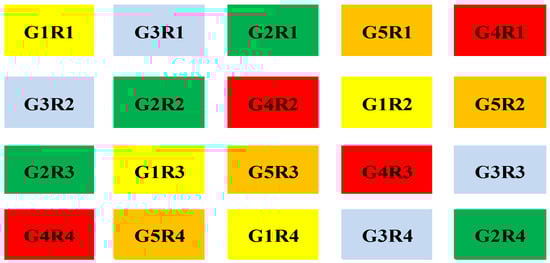 Figure 1. A schematic view of the experimental design (G1: kikuyu grass, G2: bermuda grass, G3: tall fescue, G4: buffalo grass, G5: mixture of the three warm-season grass types and R1–R4: Blocks or Replications).
