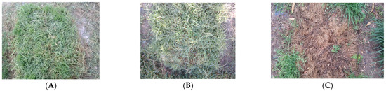 Figure 2. Example images of scored color of buffalo grass based on NTEP method: (A) score 8, (B) score 5, (C) score 1.